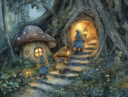 במחילות קצת חשוך, אבל הגמדים לא מפחדים. הם מדליקים פנסים קטנים שעשויים מגחליליות זוהרות, והאור הרך מאיר את המחילות בצבעים קסומים של ירוק, כחול וסגול. הם מתכרבלים יחד על כריות רכות ושמיכות צבעוניות, מספרים סיפורים ושרים שירים שקטים.