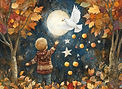 ופעם אחת, כשהגיע כבר הסתיו, רוחות קלות נשבו, ועם עלי השלכת רקדו, והציפורים הנודדות להן זמרו, ומכל עבר נראו פרחי החצב, הביאה היונה לילד הקטן חלום של סתיו. ובחלום רוקדים עלי השלכת, והרוח להם עוזרת וגם מזמרת, ובשמיים נדדו הכוכבים זוהרים ויפים. ולפתע, באור הירח נפלו כוכבי מרום, וגינתו של הילד הקטן מלאה כוכבים זוהרים, כוכבים כסופים.